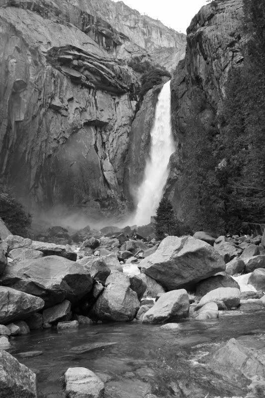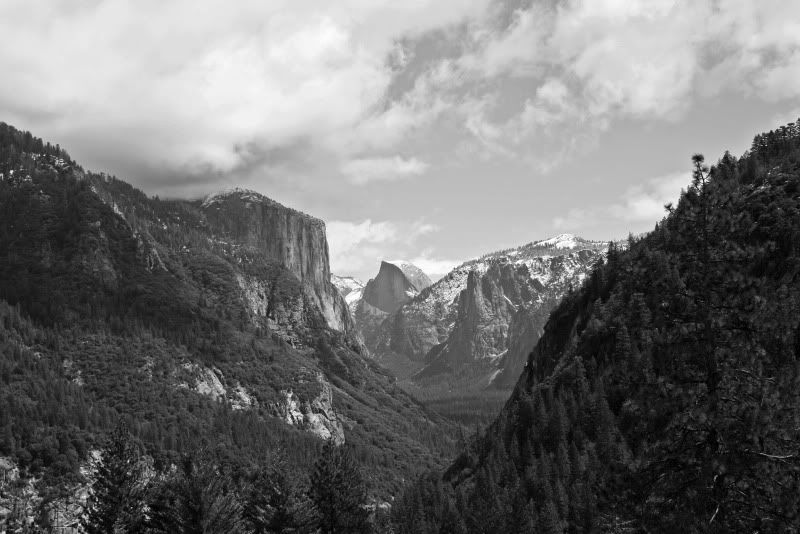 I've been wanting to go to Yosemite for a while because (1) I've heard that it's really beautiful, and (2) I love Ansel Adams and his photos from there. We went in April, but there was still snow on the ground and pretty chilly....it was spectacular! It makes you realize how beautiful and glorious nature really is. I would love to go back during the summer when I can go kayaking across the lakes and see the waterfalls in full force. Here are some pictures to share: